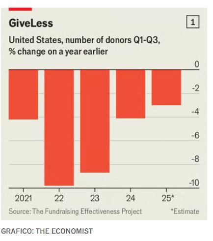 Secondo il Fundraising effectiveness project (Fep), associazione che conduce ricerche sull’efficacia delle raccolte fondi, il numero di donazioni in America è diminuito di circa il 3% nei primi nove mesi del 2025, rispetto allo stesso periodo del 2024. Un calo che riguarda tanto le classi medie quanto quelle ricche. Un’indagine della Bank of America rivela che la quota di famiglie con un patrimonio superiore a un milione di dollari che hanno fatto beneficenza è scesa dal 91% nel 2015 all'81% nel 2024 (praticamente l’1% l’anno).